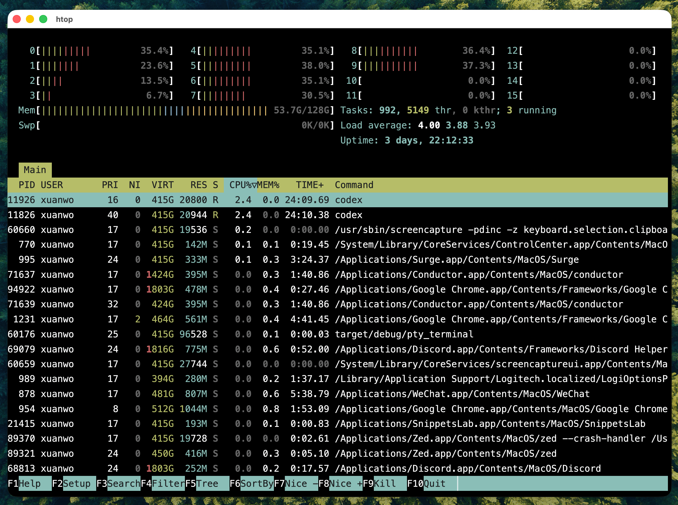That day was movie day with my wife. We watched about four movies and several TV shows. Between each episode or movie, I walked to my laptop and started a new round of testing. The main commands I used for testing were codex and htop.